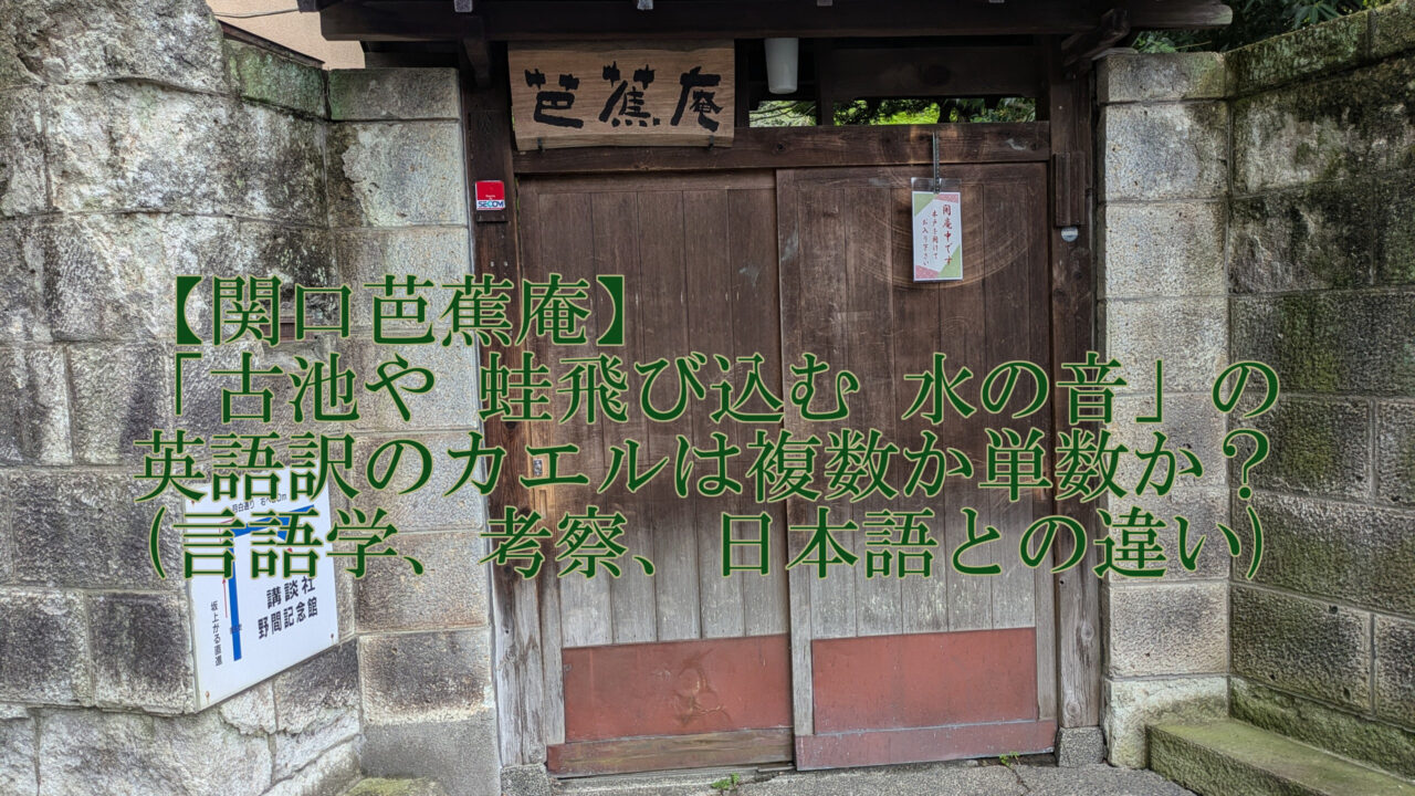 言語学者の池上嘉彦氏によれば、英語の複数形が包含するニュアンスとして、一定の時間間隔でぽつぽつと起こる一連の出来事も、複数形にする事で表現される様です。つまり、「古池や~」の句において芭蕉がその場所に一定の時間佇んで、その池に時々カエルが飛び込んでいたとすれば、カエルが複数形になるのです。この出来事を一瞬の出来事として詠んだのか、ある程度の時間の流れを感じながら詠んだのかで、frogなのかfrogsなのかの解釈が別れるのです。