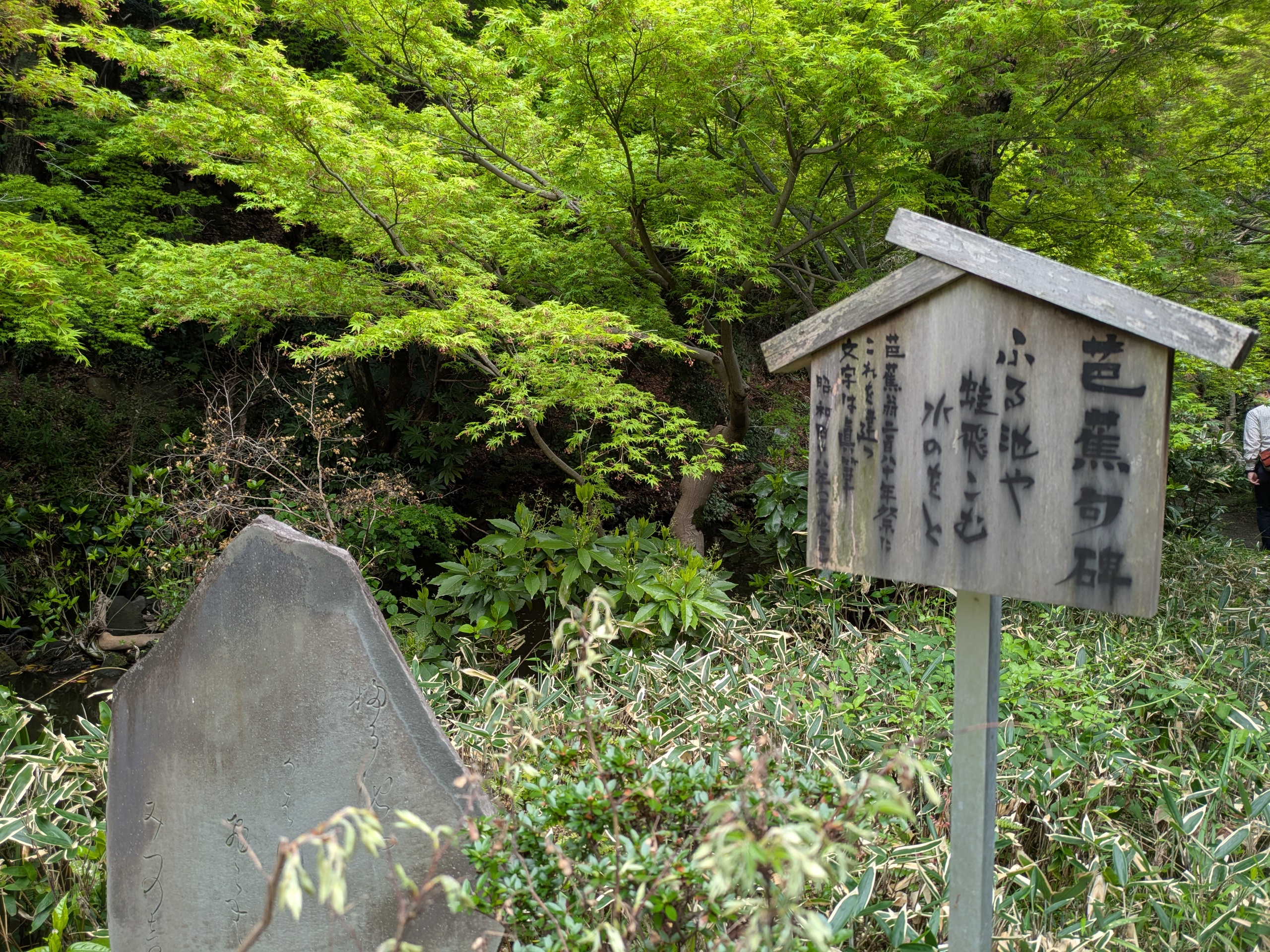 1677年から3年間程度芭蕉が暮らした場所で、現在の建物は戦後に修復されたものではありますが、ここで「古池や 蛙飛び込む 水の音」の句が生まれたのです。現地には句の石碑がありました。